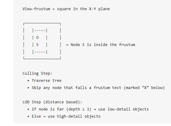 While traversing the tree, nodes that fail visibility and other criteria are skipped (culled). Nodes that pass are queried for their objects. This allows efficient population of objects in the universe.