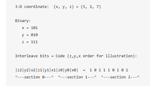 The coordinates of an object (or other aspects such as the dimension or level) can be extracted into a binary representation and then interleaved into a single string of bits. The closer two points are in the original space the more leading bits they share.