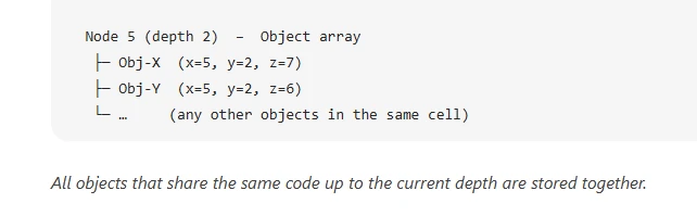 An object is stored in a node who's spatial code matches the object's code. Each node also keeps an object array of objects that belong to it. This allows for things to be within things in Star Citizen and also for faster retrieval access to objects in memory. For example, object codes for items within a ship can be located near each other in memory if the spatial code matches the object's code. Nodes for objects can be hierarchically walked quickly as the interlaced codes replace the need for other data structures.