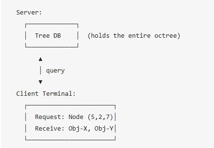 The client’s rendering engine requests all objects in visible nodes from the server. This means, in theory, that only objects that need to be shown to the client are presented and processed. This can include all aspects from graphics rendering to mission information. When a client makes a Terminal Request the game servers will return Object ID's and other data such as position, rotation, scale, mesh ID, physics flags, script references, etc. It can also return delta data for only the parts that changed since the last request to further reduce packet size. This is important because the server has more control over what happens to an object in this setup. The terminal uses the data received from the server to perform physics, AI and UI local logic and if different players see the same thing then their clients will interpret it the same at the same time (of package receipt and decompress / decode).