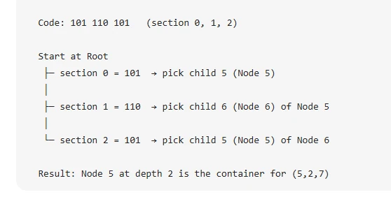 Every depth level of the tree corresponds to one section of the spatial code. Depth levels can be used to increase fidelity at higher levels (level 20) and can represent a universe at the lower levels closer to the root. In a way this creates multi dimensional universes based on the depth level with each level having its own meter scale.